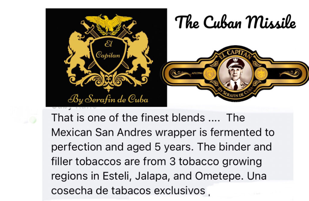 This is a big, beautiful, and dark looking San Andres wrapped ‘Cuban Missile.’ It has a very thin layer of oil, but has bold looking veins and appears tightly packed. The vintage looking gold and black band carries the cigar’s brand name ‘Tobacos Serfin’ over Reserva 2506, which encircles a photo of Jose “El Capitan” Gallinat.