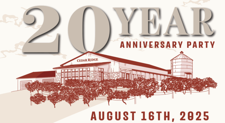 Join our friends at Cedar Ridge to celebrate their 20th anniversary with some of the things they do best: Live music, a bourbon tasting and a new release, distillery tours, a vineyard tour and tasting, and great food!