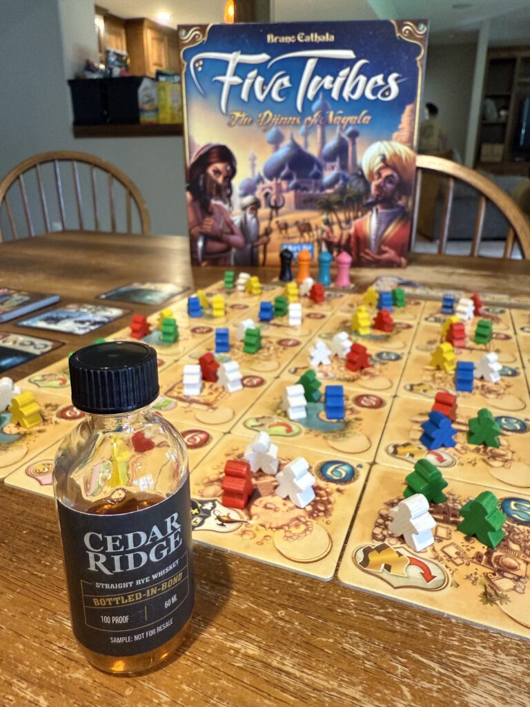 There are times when I have a hard time creating a pairing that has a good link between the whiskey and the game. This was not one of those times. I’ve talked before about how I associate colors with certain whiskies, and this rye had a ton of that – the fruit-forwardness brought forth bright reds, yellows, and greens in my mind, with the rye pop especially accentuating the brightness. Five Tribes matches that perfectly, with bright colors mixing and matching all across the board. Just as this Cedar Ridge Rye brings forth a medley of fruit flavors, Five Tribes presents a visual medley of colors. The two together create a beautiful experience!