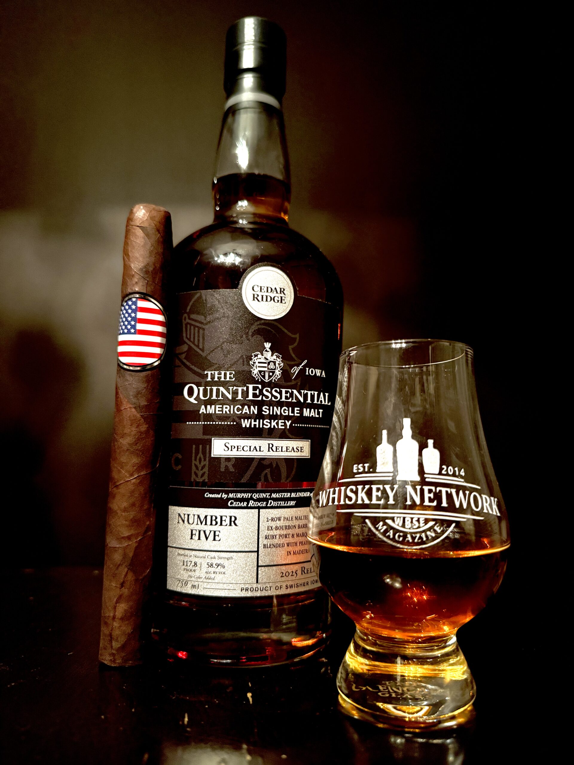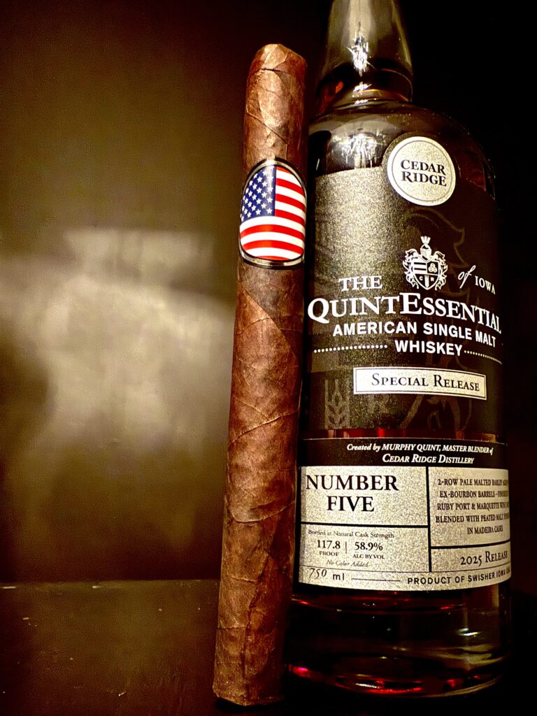 Let’s see what Cedar Ridge expression can stand up to this bold Churchill cigar. Ah of course, the obvious choice for me is their incredible 2025 Number Five Special Release version of their QuintEssential American Single Malt. This is the expression’s fifth release, finished in five different finishing casks, in honor of their 2005 distillery opening and meaning of the owner’s last name, Quint. It’s ‘QuintEssential’ because it was created by their dedicated Master Blender and owner, Murphy Quint, which means we are in for a real treat.