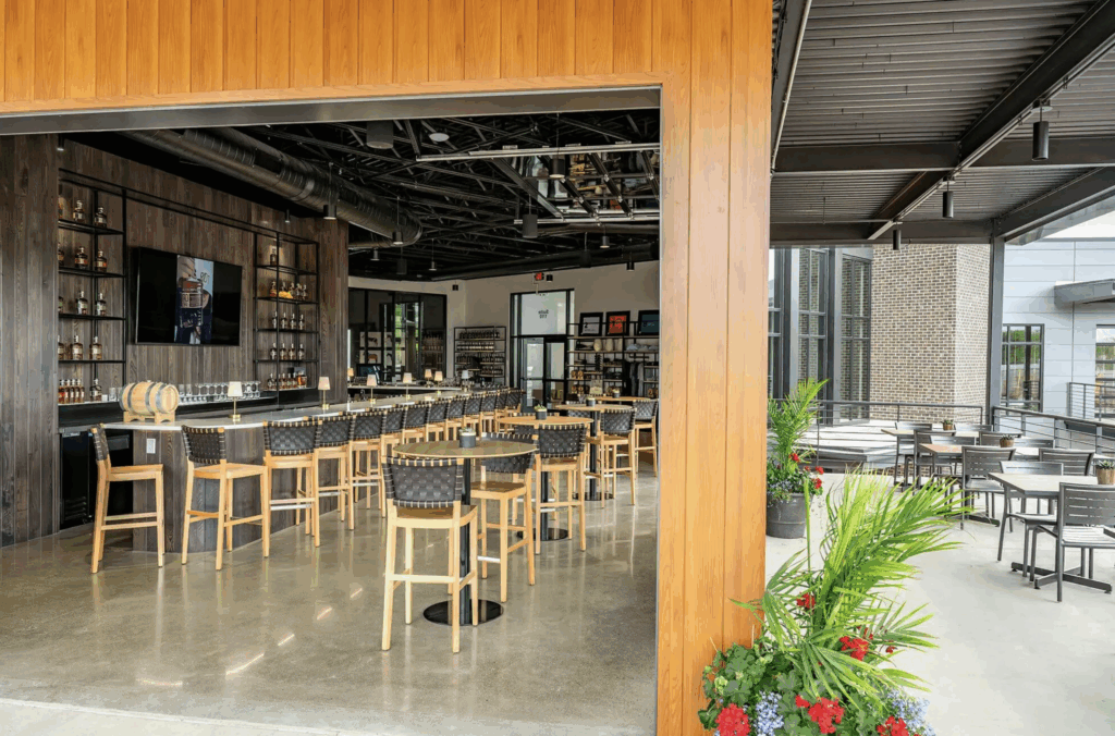 - A visually striking, 240-barrel rick—visible from inside and outside the building—frames the venue.