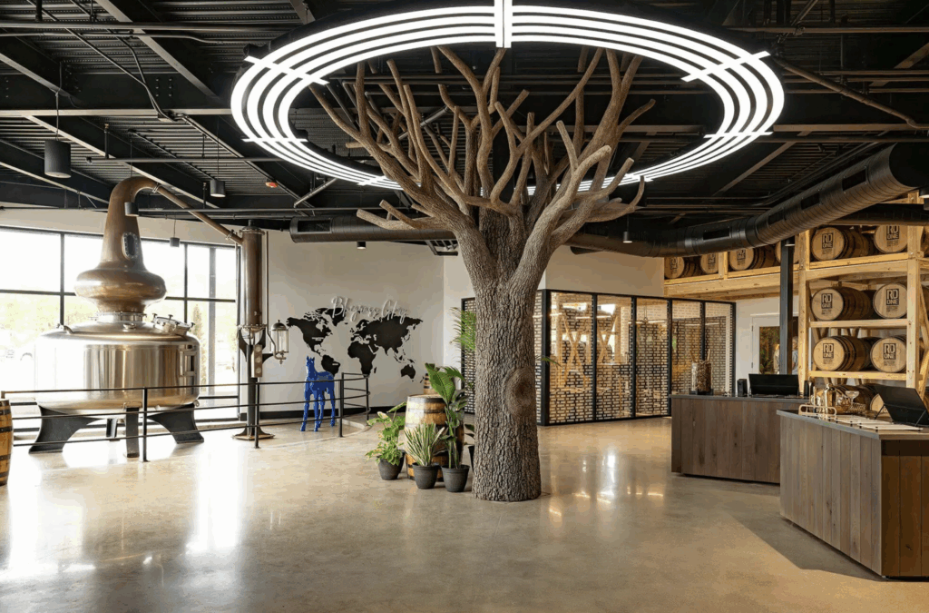 The spectacular RD1 Distillery facility includes an expansive bar, two tasting rooms, a walk-through forest and wood finishing lab where you learn about the science of the unique wood used, and even an indoor oak tree.