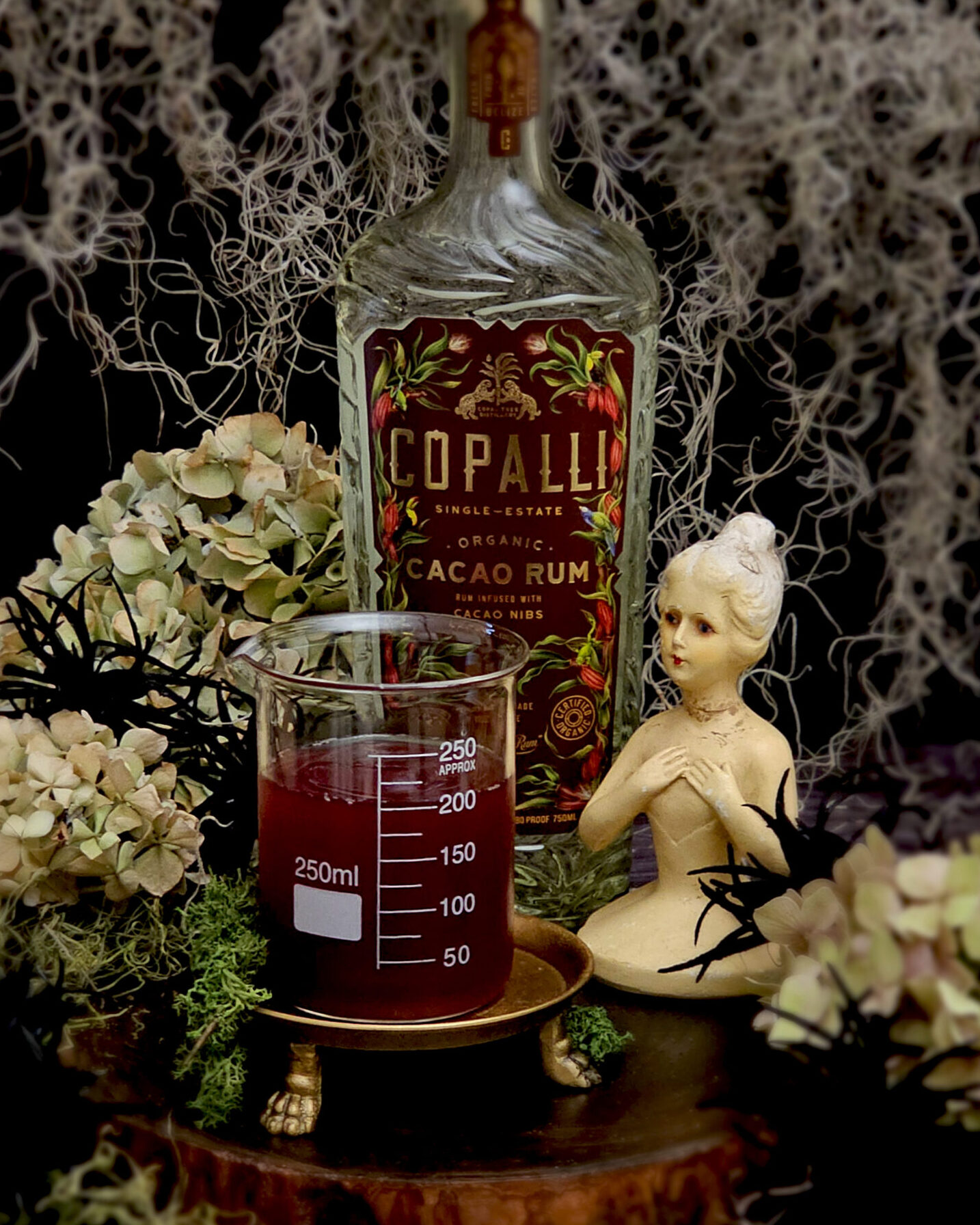 The most wonderful time of the year is upon us, soon it will be All Hallow’s Eve! You can smell it in the air, notice the changing colors all around you, and sense the welcome chill on your skin. I’m feeling particularly spooky this year, and was compelled to create a fitting cocktail to express my mood. With Halloween candy, specifically chocolates on my mind, it seemed natural to reach for the spooktacular Copalli Cacao Rum.