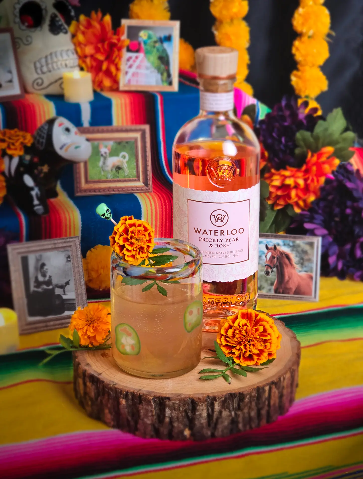 Now for the perfect cocktail to offer during Dia de Muertos, I reached for the Texas distilled Waterloo Prickly Pear and Rose Gin. A delicate balance of prickly pear and rose, combined with a homemade marigold syrup, finished with lime juice and jalapeños. Amor Mascotas includes many of the necessary ofrenda components to guide your friends and family home to you. And doesn’t everyone like to be welcomed with a cocktail in hand? Bienvenidos!