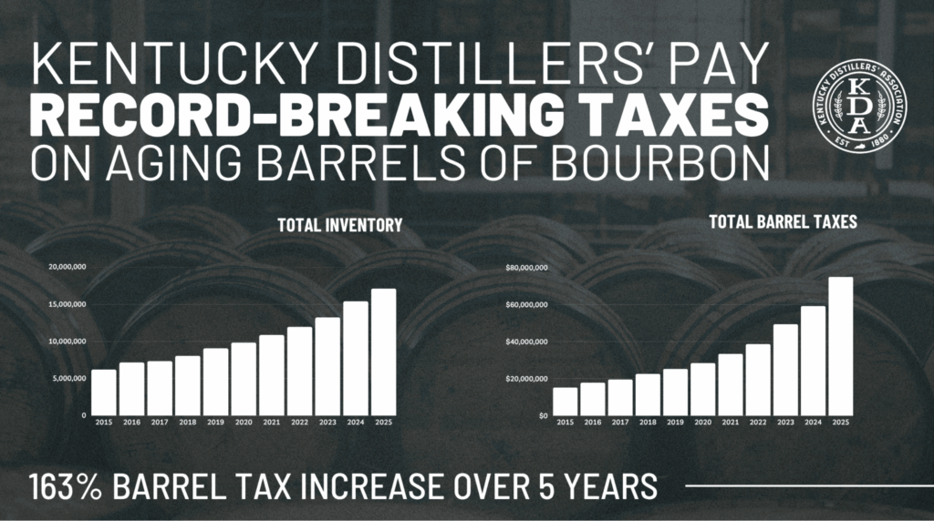The Kentucky Distillers’ Association (KDA) released the following statement this week regarding the challenges the bourbon industry is facing with record barrel inventory and what it calls “skyrocketing” taxes: