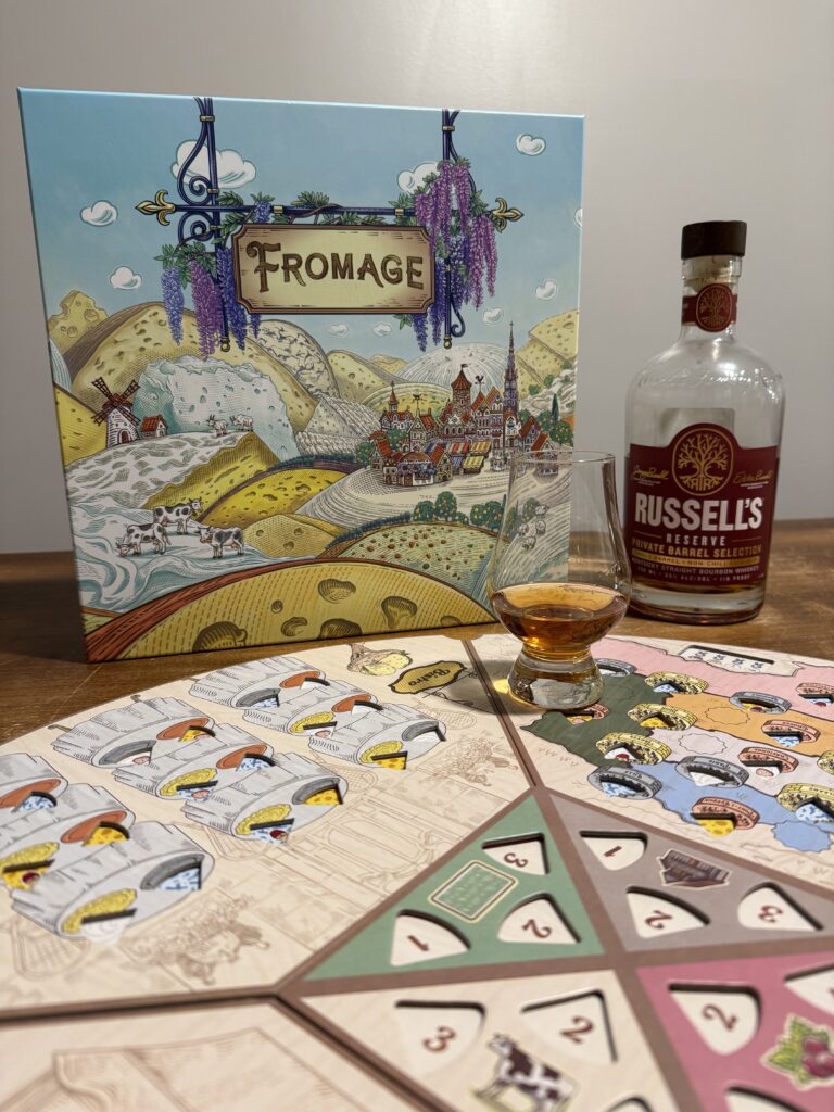 The theme of this pairing is delivering all the classic notes while nailing new twists. Fromage has all the hall marks of a good medium-light euro – tight resource management, competition with other players for spots on the board, but not being overly dense or opaque with its ruleset. At the same time, Fromage brings several new ideas that make the whole thing feel fresh and new. Bonus point for how quick this game plays – the simultaneous player turns really speeds up the process and increases the replayability. Likewise, this Russell’s Reserve barrel pick delivers all you’d want in a good bourbon, packing delicious variations of caramel, vanilla, and baking spices. But notes of marshmallow, butterscotch, and cola are all there as well, which I don’t find on many bourbons and make this pour feel fresh and unique. If you appreciate quality remixes of classic oldies, you’ll appreciate this pairing. And a hint – this is pairing is made even better with good sharp cheese alongside the whiskey, such as Gouda, Sharp Cheddar, and Blue Cheese.