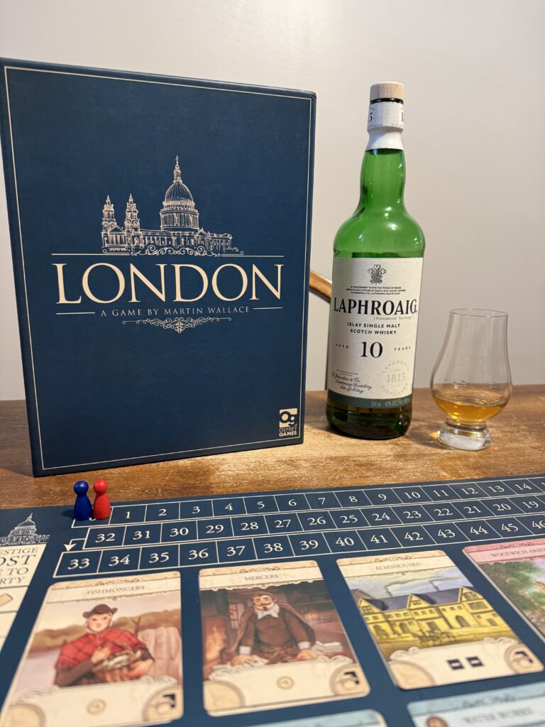 This pairing has less to do with the notes in the whiskey or the design of the game and more to do with what you exude while drinking Laphroaig or playing London – class. It’s easy to be classy drinking an old wine vintage or staying in a five-star hotel. It’s a little less easy to look classy playing a board game, but London pulls it off. The beautiful, nostalgic art and elegant cover, along with the visual of seeing a city tableau build up over time, make for a scene James Bond would strive for (an exaggeration you say? Maybe…). Laphroaig, on the other hand, is no doubt a classy pour. Islay rivals Highland for the most iconic Scotch region, and sitting back and sipping a Laphroaig is one of the more stylish experiences you can have, in my opinion. So, sit back, pour some Laphroaig, start building London, and enjoy how sophisticated you are.