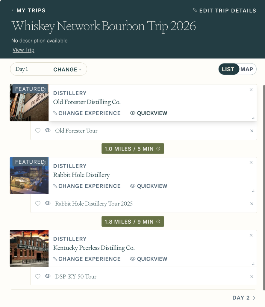 The easy-to-use free planner offers suggested itineraries or you can build you own custom journey. It breaks Kentucky’s distilleries into six regions, will let you plan trips covering various days, includes information about dining, hotel, and other tour options, and even lets you share your final plans with friends and family. Once you’ve built your itinerary, you’ll still need to contact each distillery to make reservations and purchase tickets.